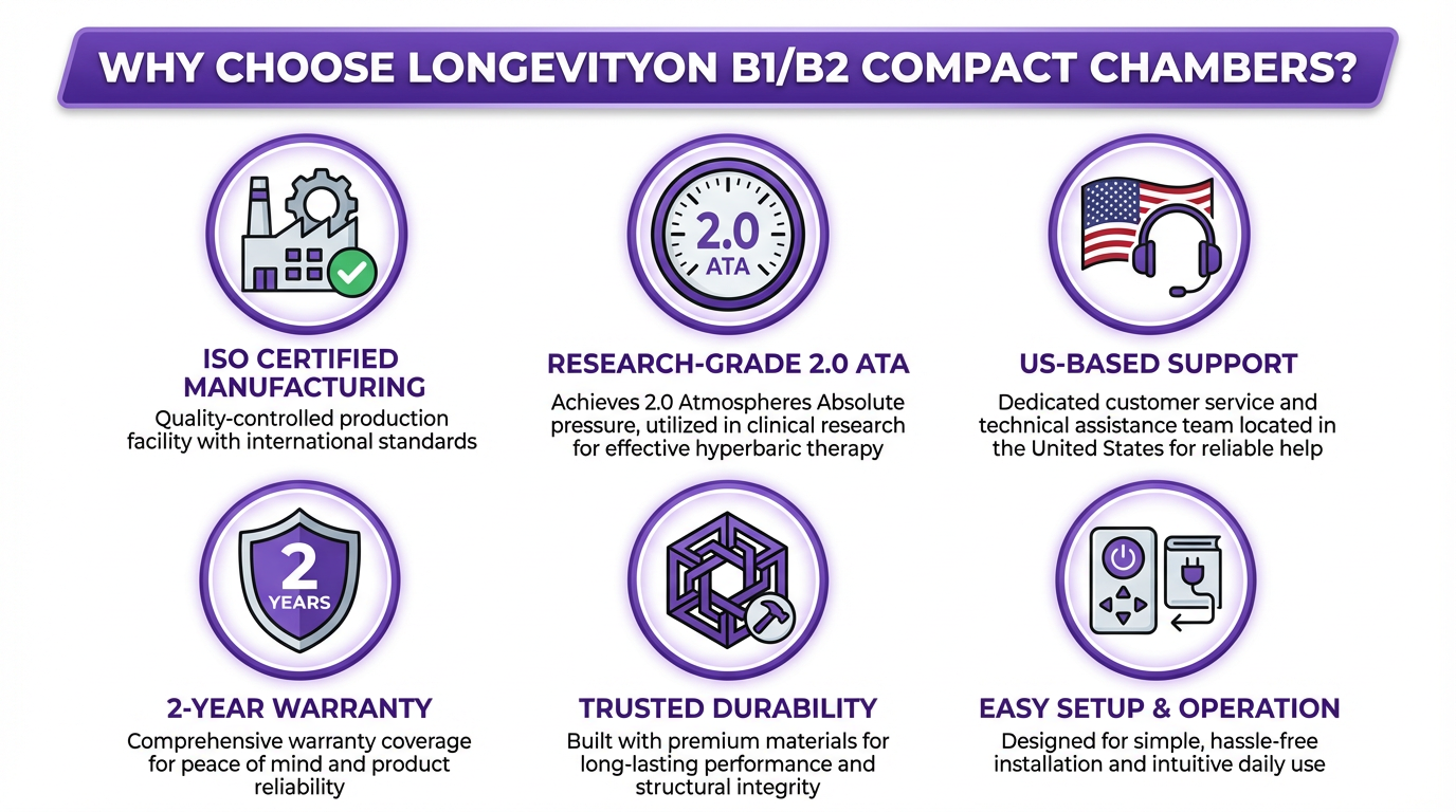 Our team provides personalized consultation to help you choose the right chamber for your space, needs, and budget. Every LongevityON chamber reaches research-grade 2.0 ATA pressure - we'll help you find the perfect fit.